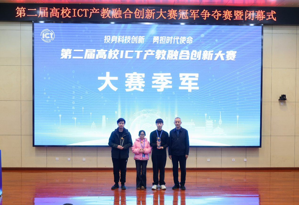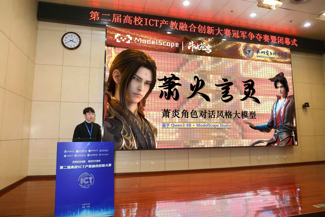 2025年12月7日,第二届高校ICT产教融合创新大赛全国总决赛在西安电子科技大学圆满落幕。学校此次整体斩获1个季军、3个一等奖、8个二等奖的优异成绩,我院学子的突出表现成为重要助力。在本次赛事中,由林文倩老师指导,文培煊同学带队创作的《萧火言灵—萧炎角色对话风格大模型》在“人工智能+”赛道中以小组第一名的成绩取得国家级一等奖荣誉,并在跨赛道冠军争夺赛中勇夺全国季军,实现国家级奖项双丰收。